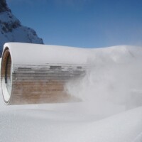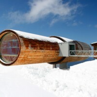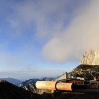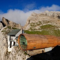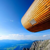 Das Gebäude besteht aus zwei ineinander geschobenen Betonröhren, die auf einem zylindrischen Treppenaufgang platziert sind. Dank seiner natürlichen Fassade aus Lärchenholz fügt sich das Gebäude nahtlos in die Umgebung ein. Das Zentrum gibt Einblick in das alpine Ökosystem der Region und lässt seine Besucher 1.300m in die Tiefe blicken. Weitere Informationen finden Sie auf der Webseite der Alpenwelt Karwendel.