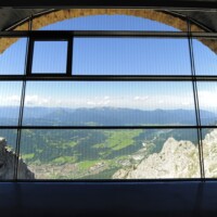 Das Fernrohr liegt 2.244m hoch in die Karwendelgrube gebettet und schweift mit seinem Blick in das Wetterstein- und Estergebirge. Direkt daneben gelegen befördert die Karwendelbahn jährlich über 100.000 Besucher von Mittenwald aus auf die Grube nahe der westlichen Karwendelspitze.