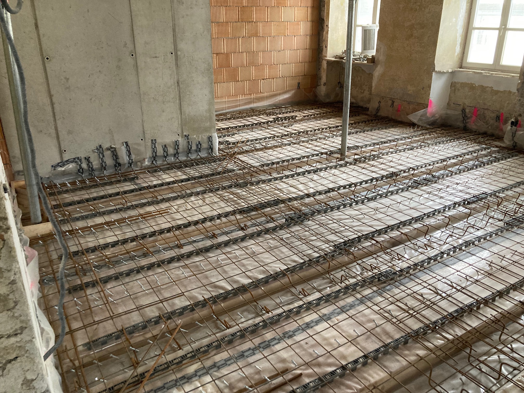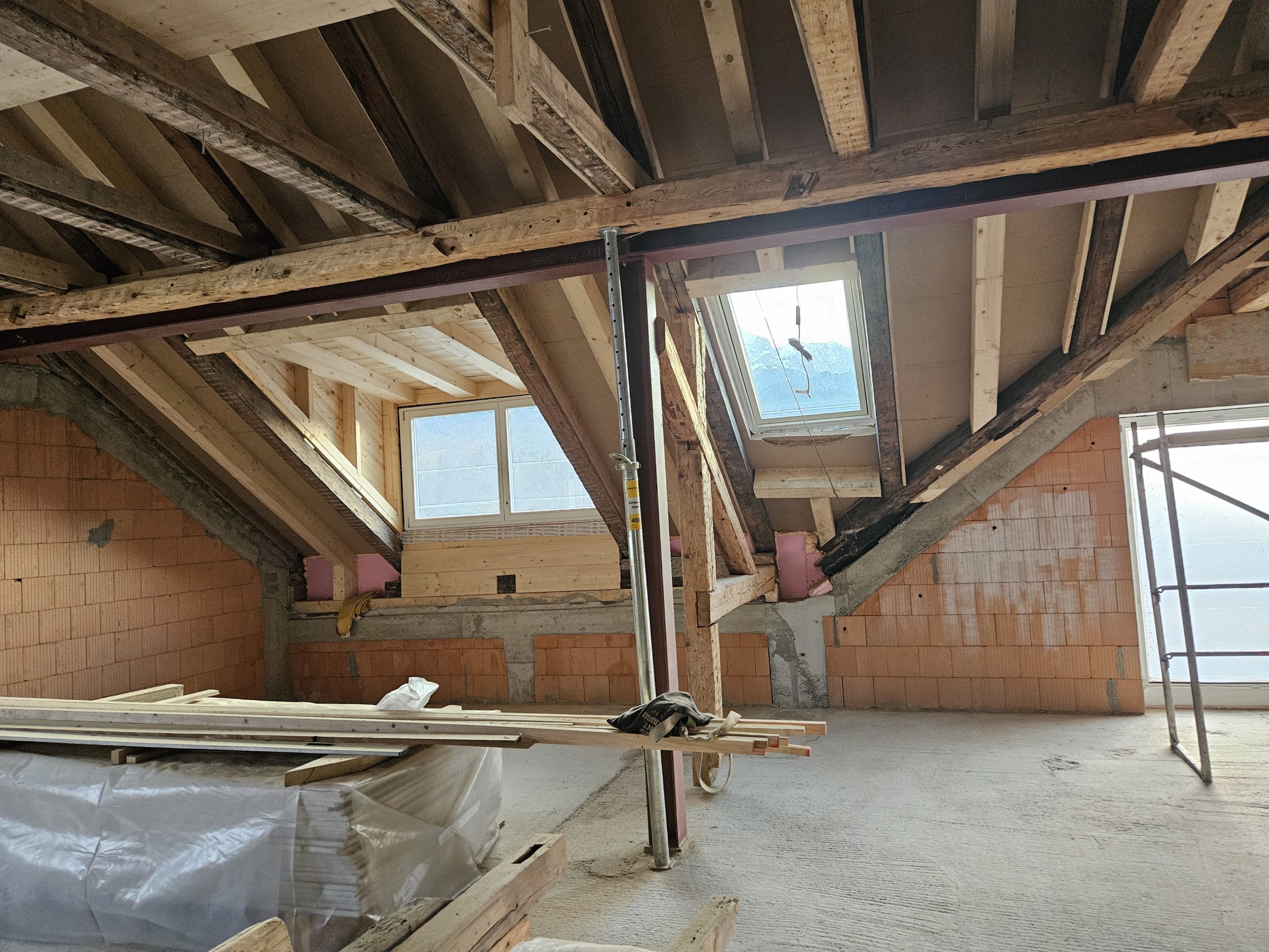 Um die Tragfähigkeit zu erhöhen, wurden Holzbetonverbunddecken eingebaut und über dem zweiten Obergeschoss eine Stahlbetondecke ergänzt. Das Dach wurde durch neue Sparren, Mittel- und Firstpfetten stabilisiert. Zudem wurde ein neuer Treppenhauskern mit Aufzugsschacht integriert und das Fundament mit einer Stahlbetonplatte verstärkt.
