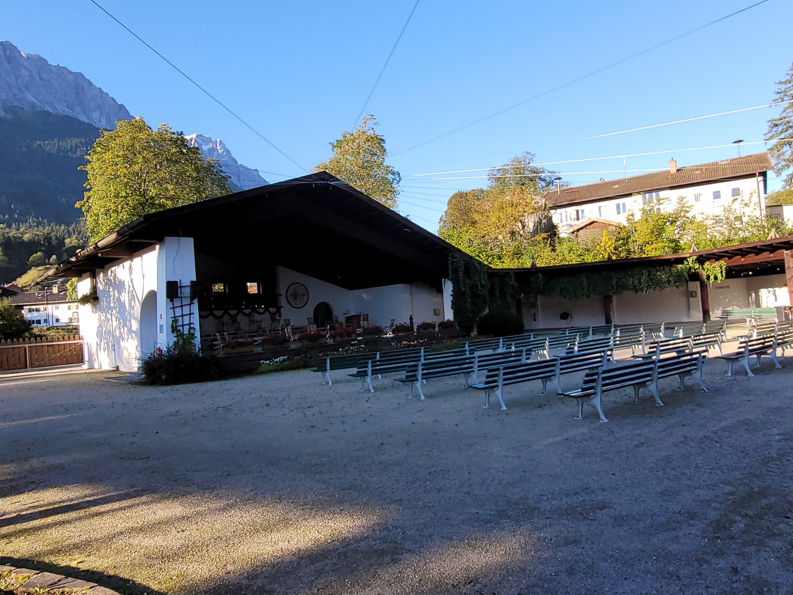 Der Musikpavillon in Grainau besteht aus zwei Gebäuden, der eigentlichen Musikbühne mit einer Firsthöhe von etwa 7,0 m und einer halbkreisförmigen Zuschauerüberdachung (oder WandeIhalle) mit etwa 3,70 m Höhe. Dazwischen liegt ein nicht überdachter Hof für die Aufstellung von Sitzplätzen. Über diesem Hof wird bei Veranstaltungen im Sommer ein Zeltdach aufgebaut, das nach Beendigung der Veranstaltung wieder abgebaut wird. Dieses Zeltdach wurde statisch geprüft, neu bemessen und entsprechend verstärkt.